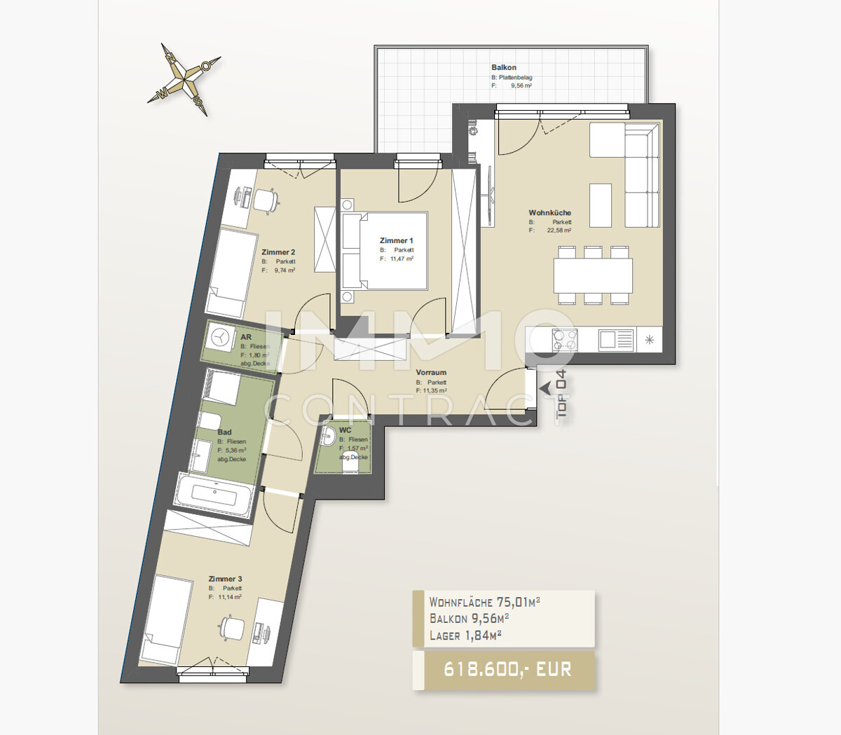 Diese durchdachte Vierzimmer-Wohnung mit einladendem Balkon in den begrünten Innenhof wird Sie begeistern! Sie gliedert sich in eine Wohnküche und ein Elternschlafzimmer, von denen aus der Balkon begehbar ist. Zwei Kinder- bzw. Arbeitszimmer, ein Badezimmer mit Dusche, Badewanne, Toilette sowie ein Abstellraum und separates Gäste-WC komplettieren diesen besonderen Grundriss. Auf Wunsch kann diese Wohnung auch als luftige Dreizimmer-Variante erworben werden!