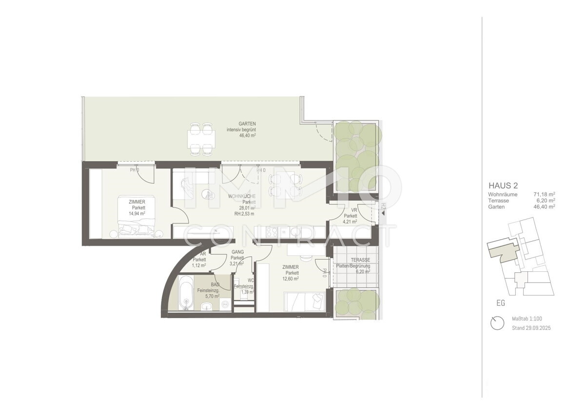 Haus mit Garten geschützt im Innenhof - vom Vorzimmer geht es in ein Wohnesszimmer, das auf den eigenen Garten ausgerichtet ist.