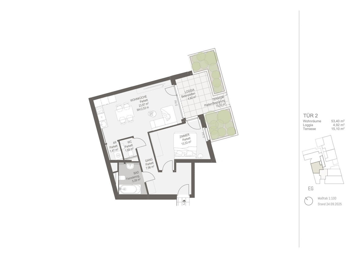 ERSTBEZUG mit großer Terrasse im Innenhof – moderne 2-Zimmer-Wohnung