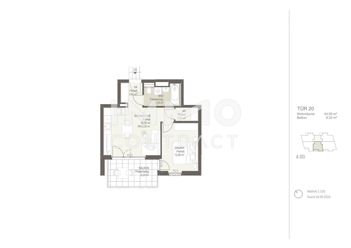 Vom Vorzimmer mit Nische für eine Garderobe geht es ins Wohnesszimmer und Badezimmer. Das Wohnesszimmer ist auf den sonnigen Balkon ausgerichtet. Über einen Flur erreicht man den Abstellraum und das Schlafzimmer. Auch über das Schlafzimmer gelangt man auf den Balkon.
