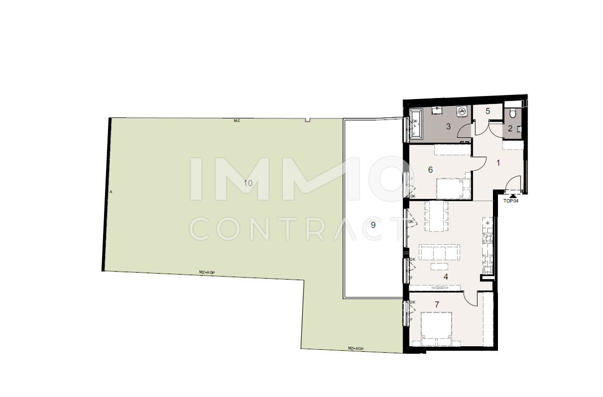 Das großzügige Vorzimmer schafft einen angenehmen Empfangsbereich mit ausreichend Platz für Stauraum und Garderobe. Der offene Wohn- und Essbereich bildet das Herzstück der Wohnung – lichtdurchflutet, funktional und mit direktem Zugang zur Terrasse und dem Eigengarten. Hier lassen sich Alltag und Freizeit perfekt verbinden – ob beim Spielen mit den Kindern oder beim Entspannen im Grünen.